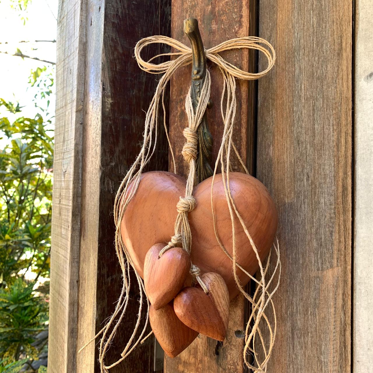 Coração de madeira cedro de 16cm, boleado de um lado, cor madeira com proteção de verniz mais 3 corações de 6cm pendurados no coração grande.