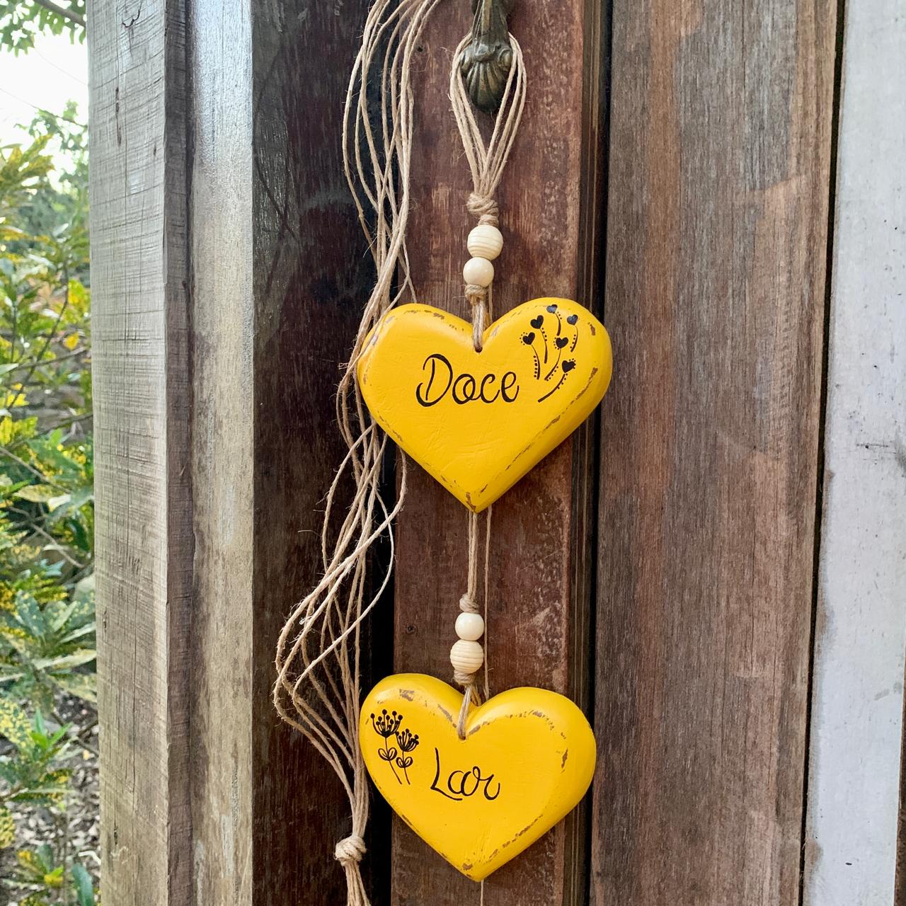 Duo de corações de madeira amarelos 12x10cm, boleados de um lado, com palavras "Doce Lar", acabamento com fio de rami e contas de madeira cor nude.